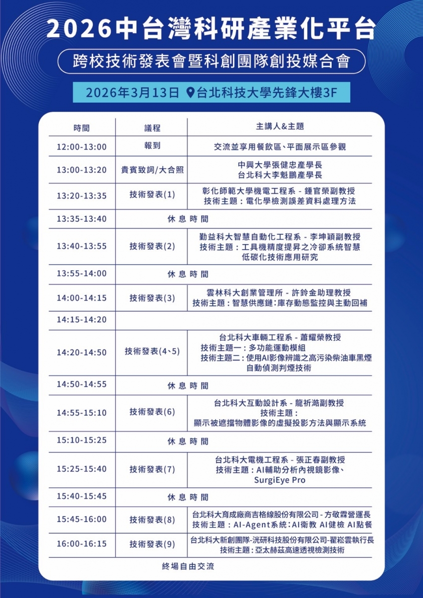 • 活動現場將規劃平面成果展示區與實體技術發表場次,呈現各校具產業應用潛力之研發成果,並邀請創投業者與產業代表到場觀覽與交流。